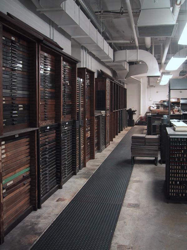 This is the hallway that leads from the pressroom to the foundry (and vice-versa). The boxes on the right hold quads and spaces, and the shelves are full of type, ready for shipping. The ladder is fully functional. The green drawers to the left hold loose sorts. | |