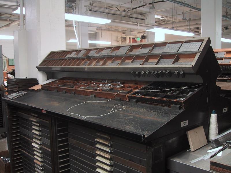 We have many many many cases of type, some of which came from the Grabhorn Press, others from Mackenzie & Harris. The trim saw, which we use to cut slugs and undercut (kern) characters, sits in the back. | |