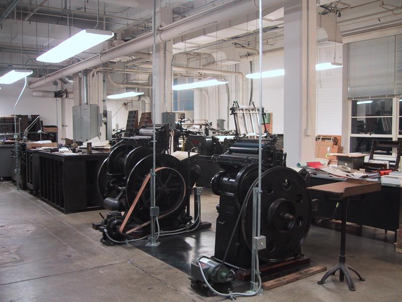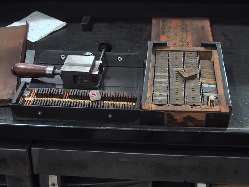 We have six complete composition casters, each with its own quirks, each suited for a certain size. The farthest caster is connected via a serial box equipped with microswitches to a Macintosh Quadra, allowing us to feed text files to the caster. | |