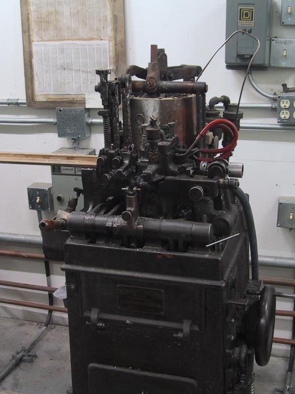 We have six complete Thompson casters, one of which dates back to the beginning of Mackenzie & Harris (then known as the Monotype Composition Company) in 1915. The chart hanging from the pipe indicates point to inch conversions. | |