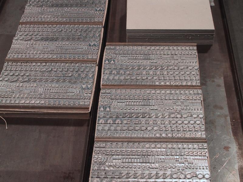 After fonts are cast, they are made up into rows of 36 pica lines, tied up, cased by chipboard and foam, and wrapped for shelving or shipment. Here are capital fonts of 36 point Centaur (Bruce Rogers). |