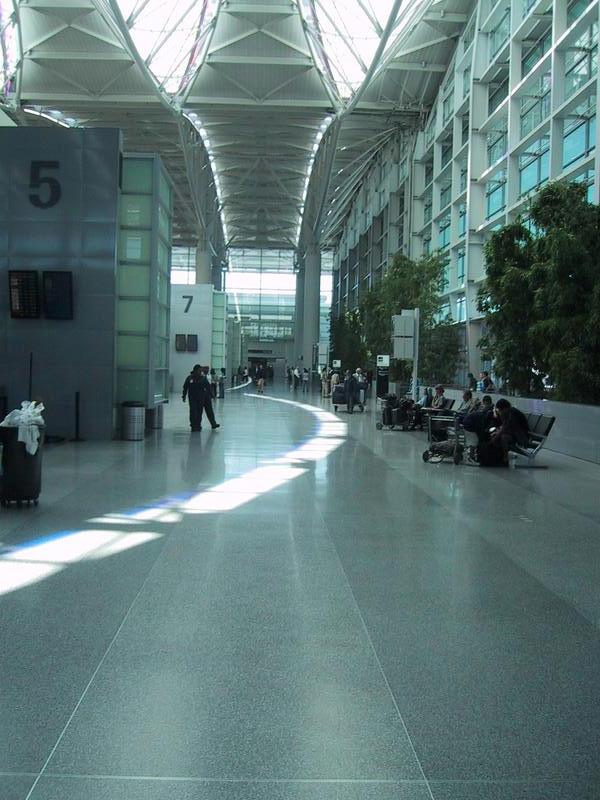The main hall of the airport's international terminal. Note the purple and blue castings on the floor from the skylights. | |