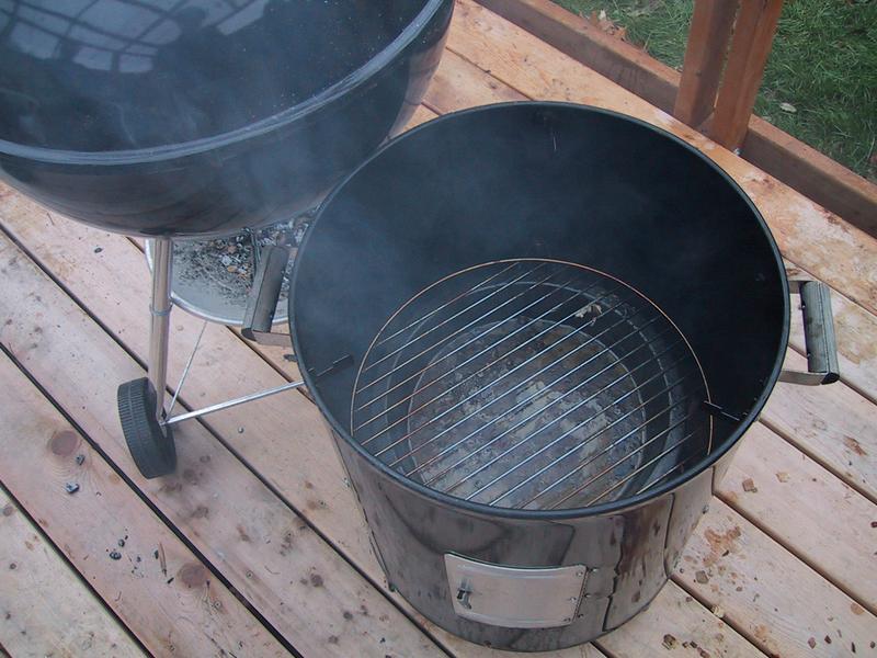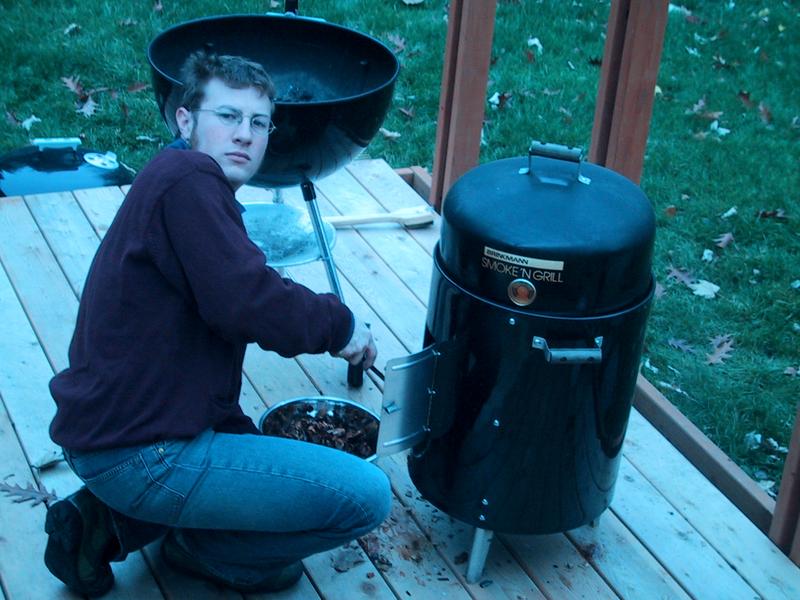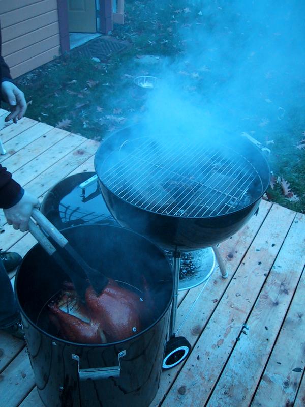 Mike and Jamie, smoke, and basting, with the bird on the grill. | |