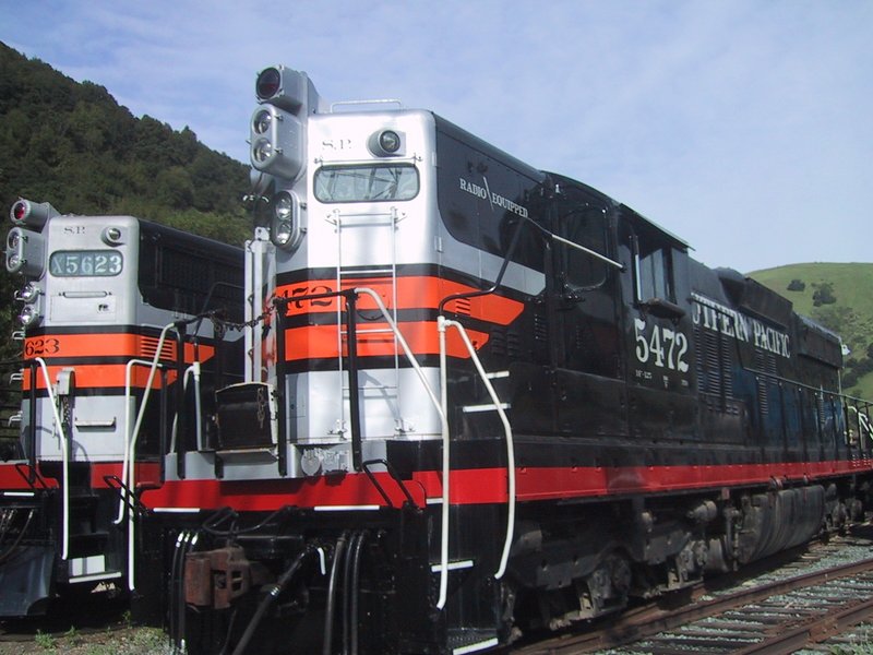 Two beautiful SP diesel-electric locomotives painted in the Black Widow scheme. | |
